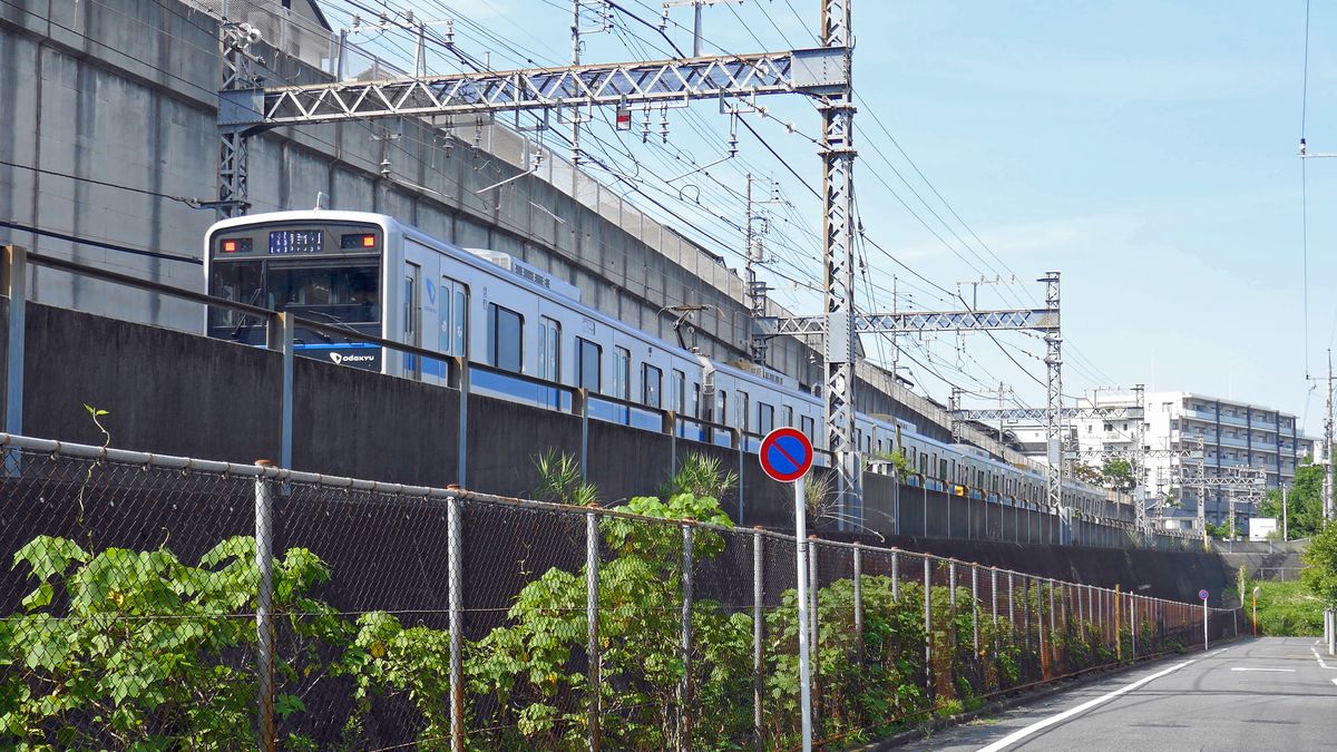 昨日、小田急永山駅で見損なったので、今日は唐木田駅の手前で見てきた。15時前後の到着、出発なので「危険な暑さ」のピークに出かける。走り始めはたしかに |